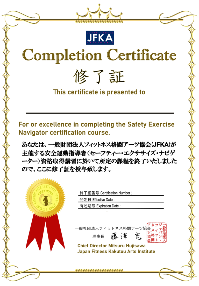 | 協会名 | 一般社団法人ジャパン・フィットネス格闘アーツ協会(JFKA) |